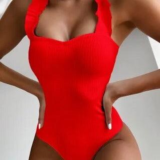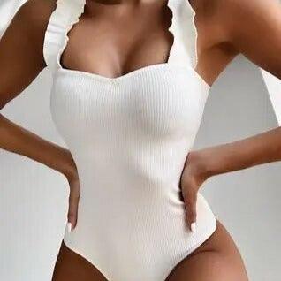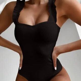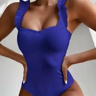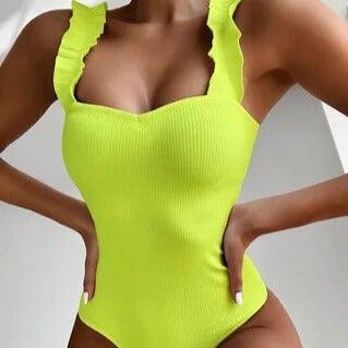 Model Samira to minimalistyczny, ale efektowny jednoczęściowy strój kąpielowy, który przyciąga uwagę uroczymi falbankami na ramiączkach i prążkowaną fakturą materiału.