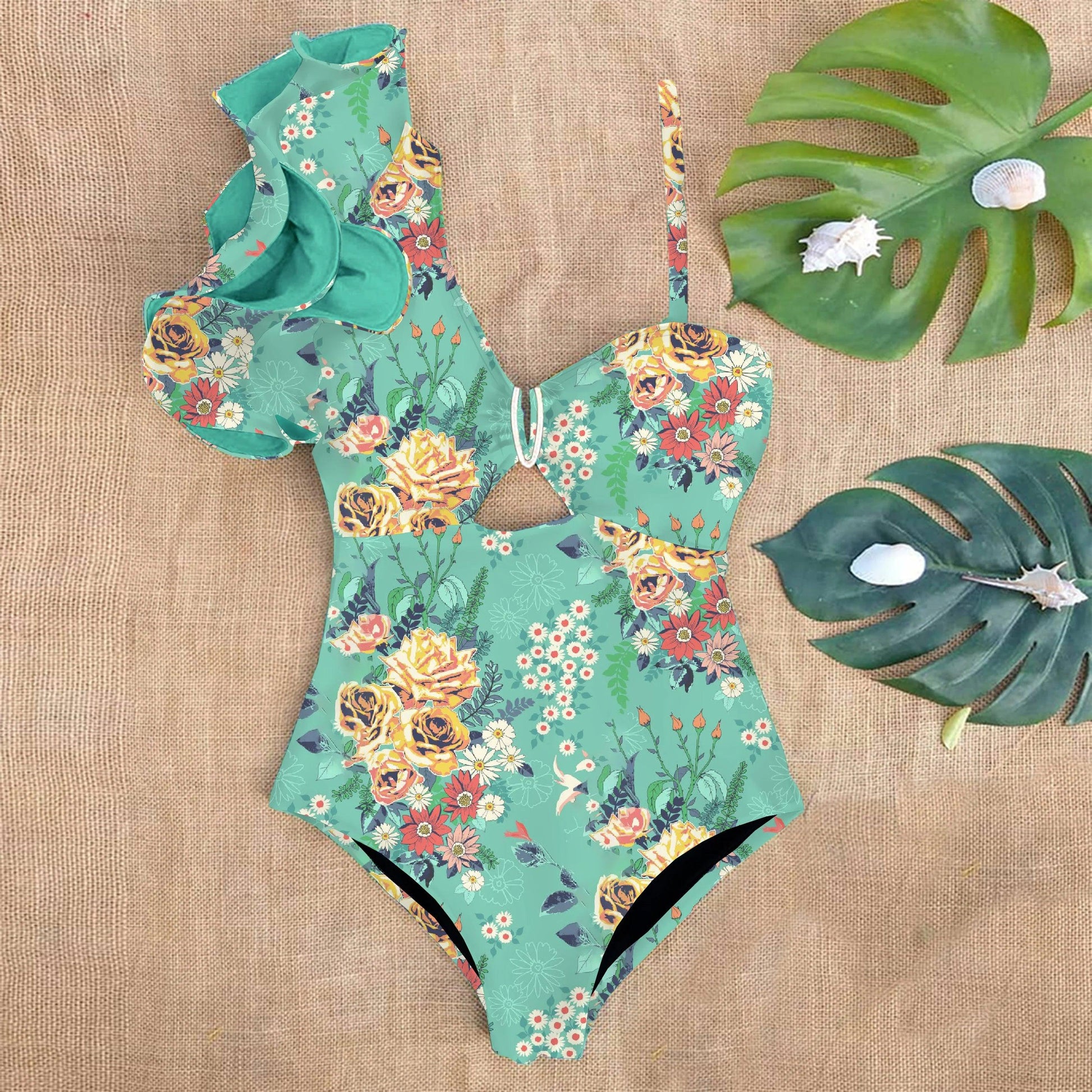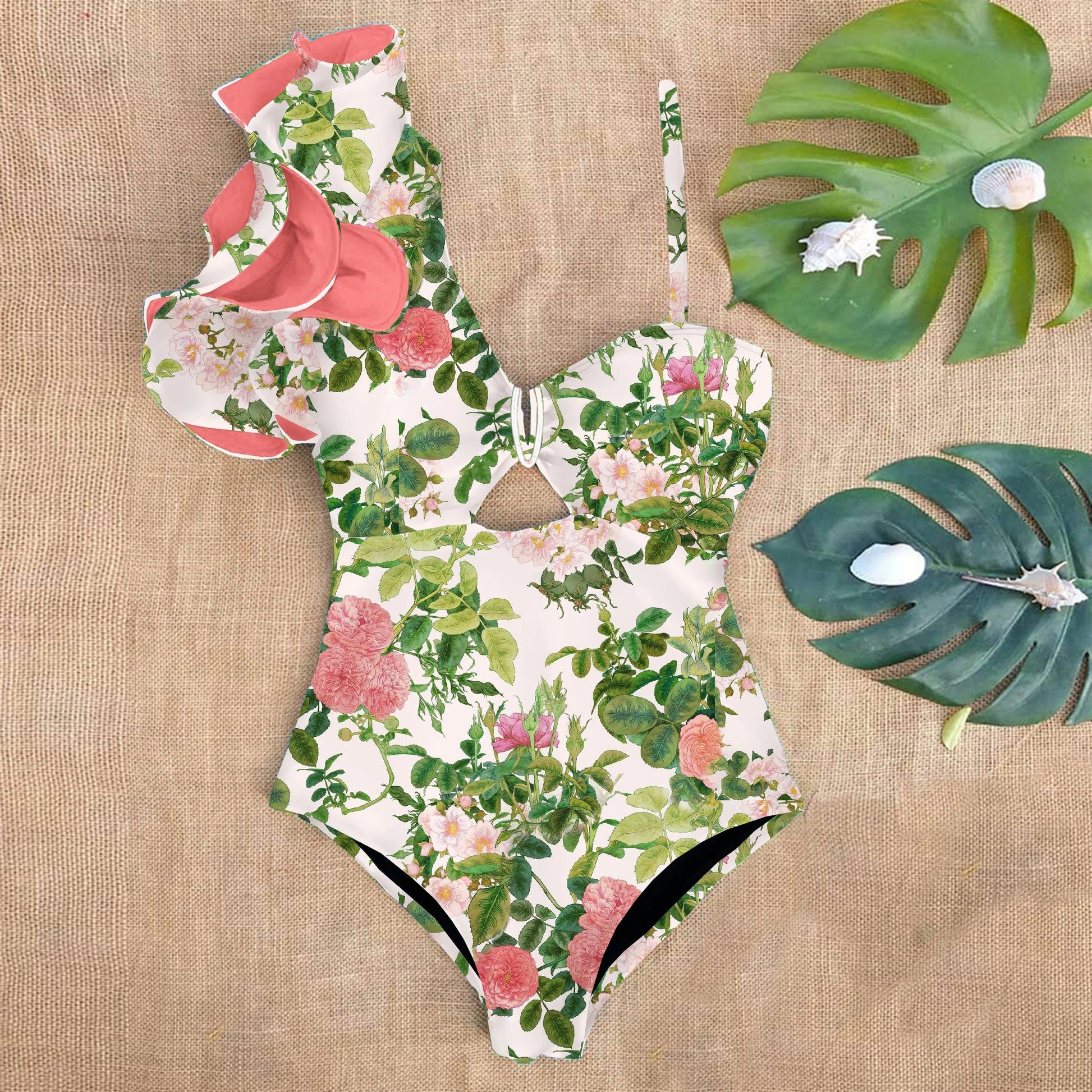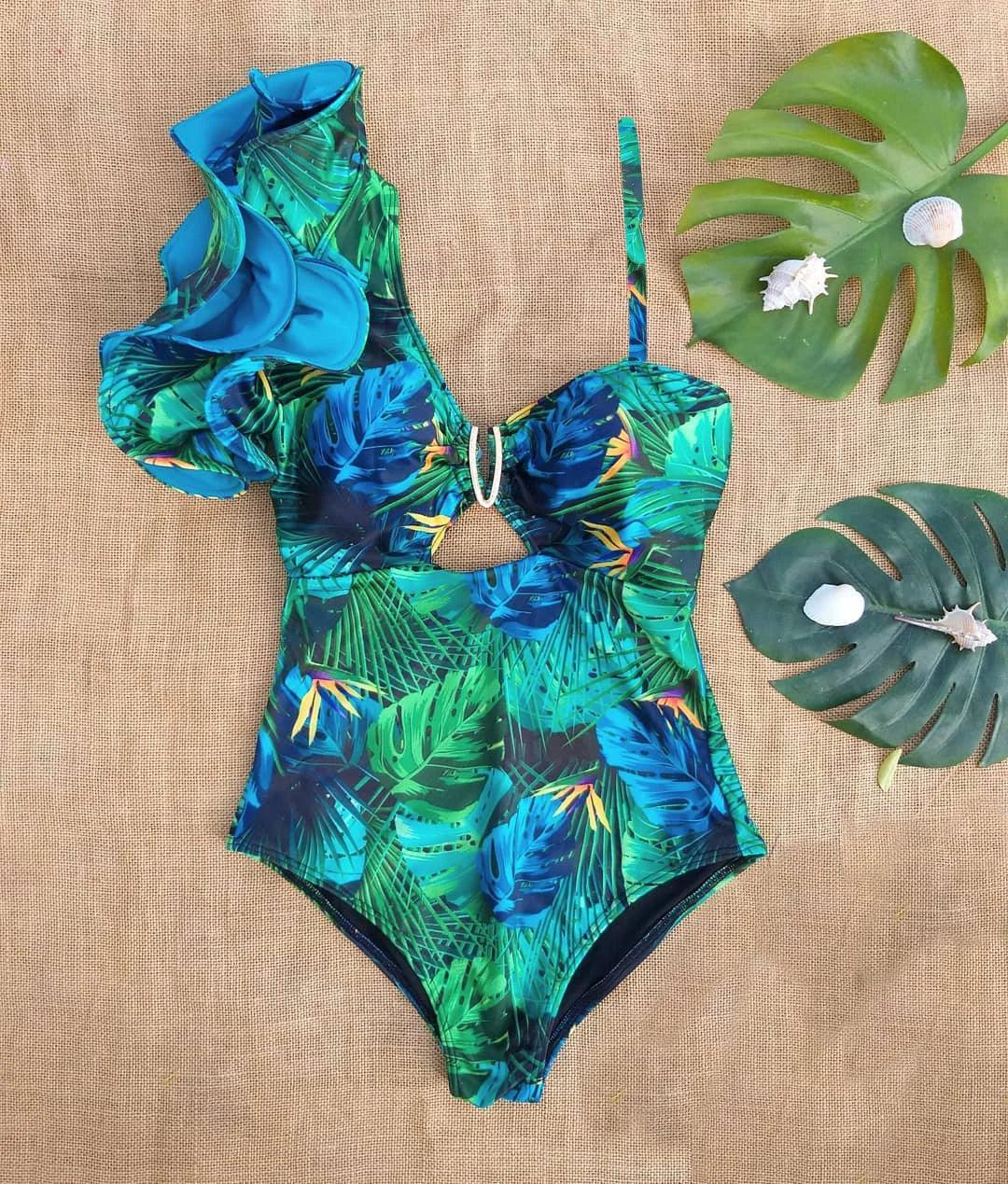 Model Lisandra to idealna propozycja dla kobiet, które uwielbiają połączenie egzotyki, kobiecości i wygody. Piękny roślinny wzór i asymetryczna falbana na jednym ramieniu dodają mu lekkości i oryginalności. Dzięki regulowanemu wiązaniu, strój można idealnie dopasować do sylwetki.