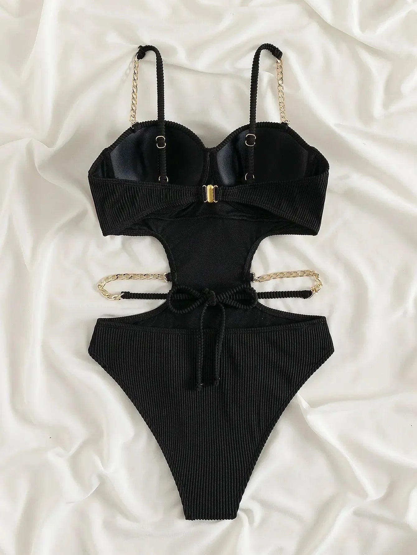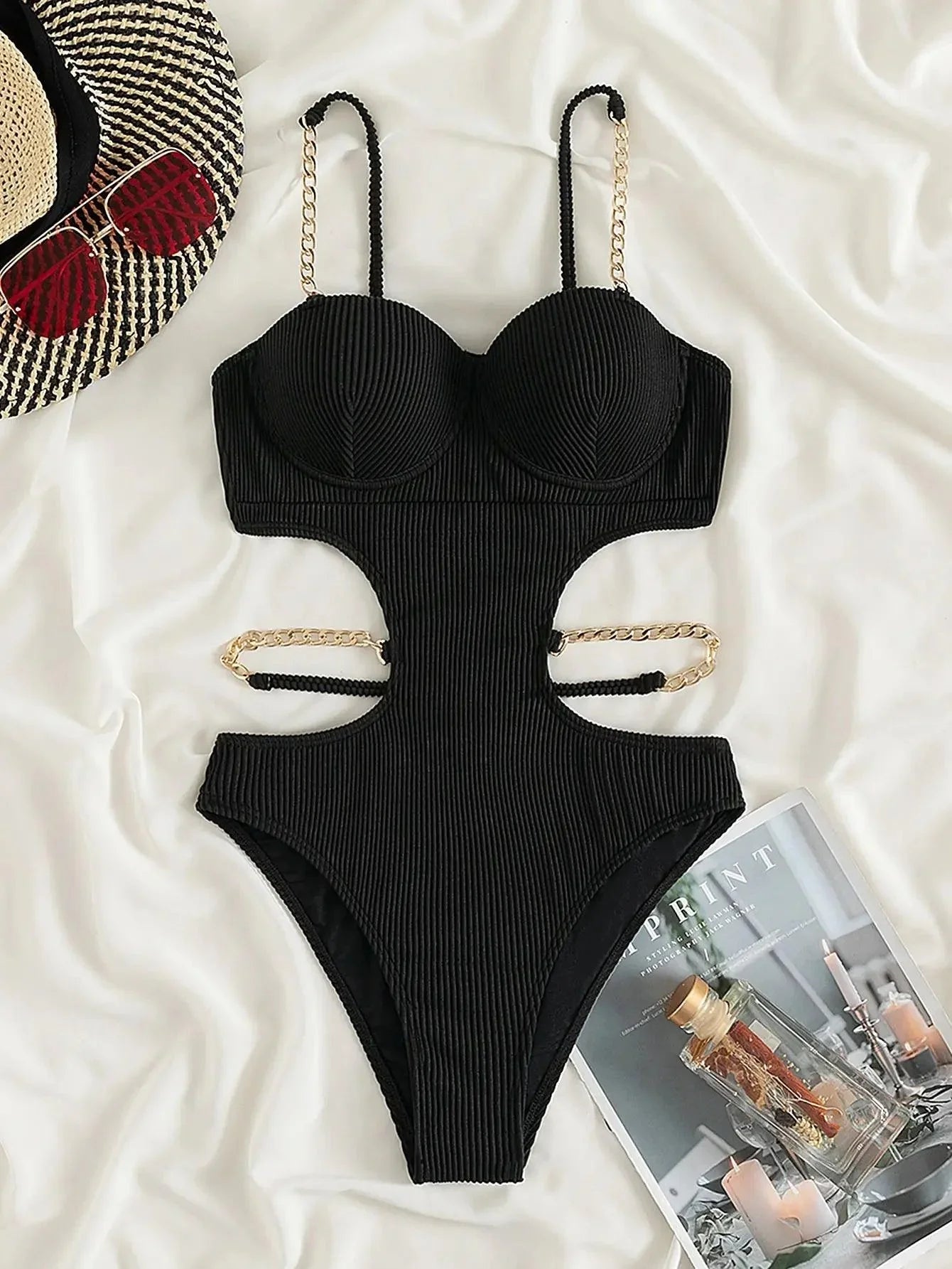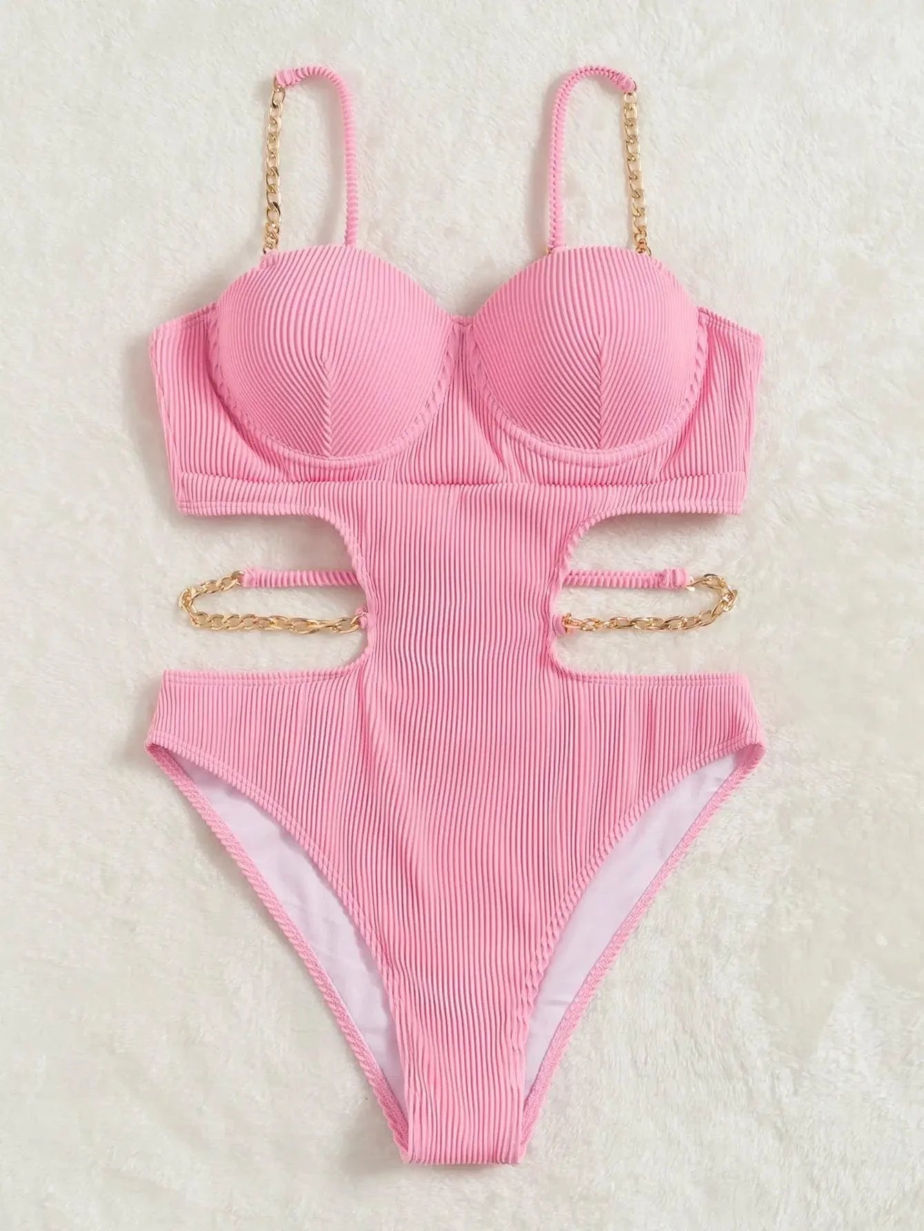 Model Belise to jednoczęściowy strój kąpielowy, który doskonale podkreśla talię i biust, łącząc klasyczną elegancję z nowoczesnym pazurem. Wycięcia po bokach i ozdobne łańcuszki na ramiączkach przyciągają spojrzenia i dodają kobiecości.