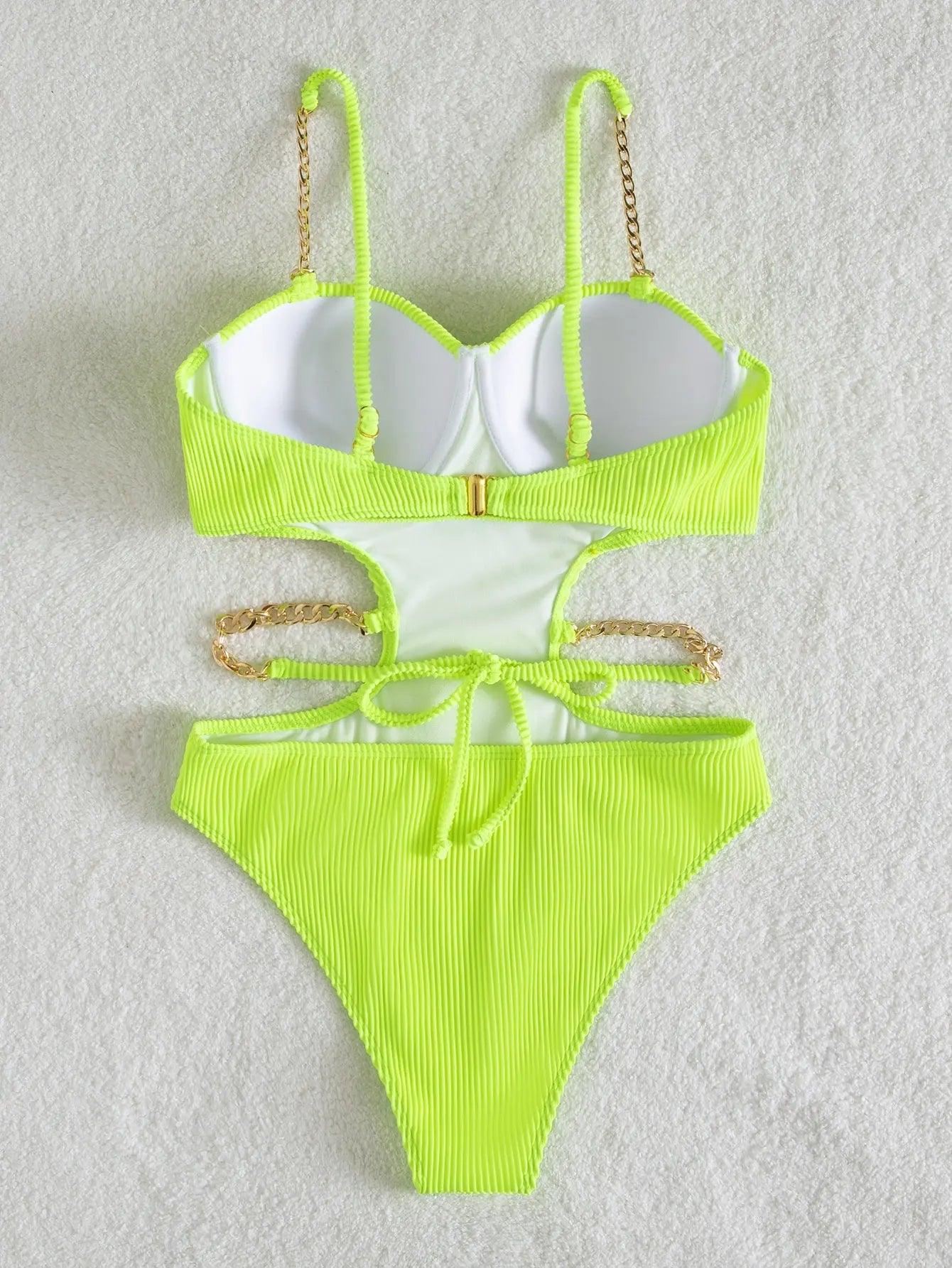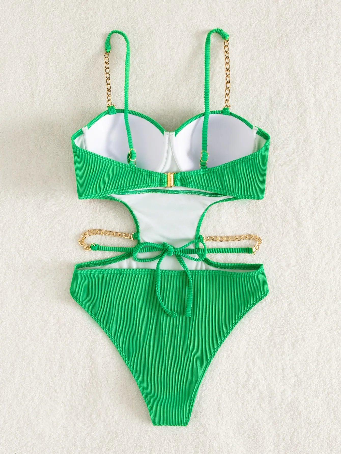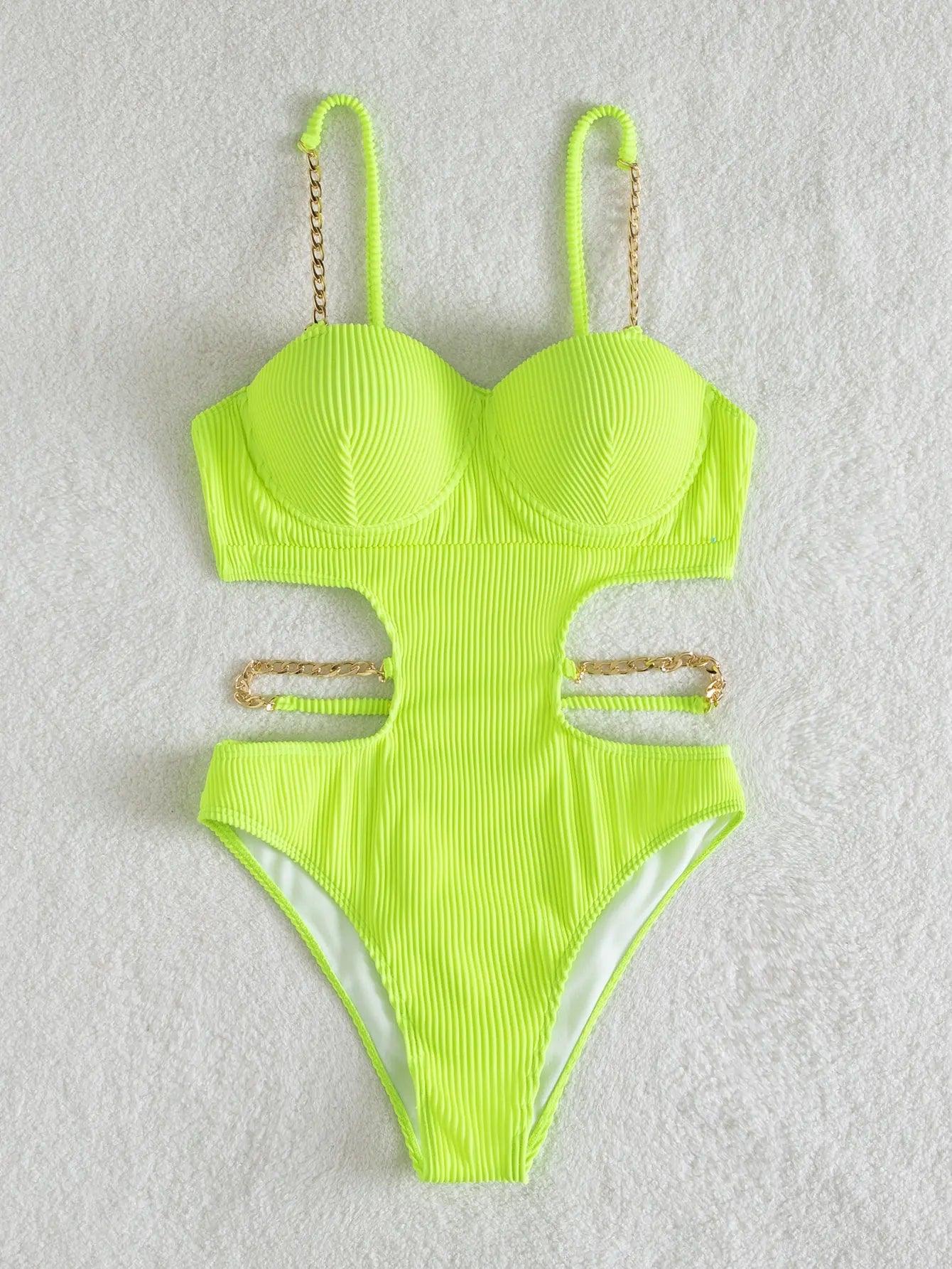 Model Belise to jednoczęściowy strój kąpielowy, który doskonale podkreśla talię i biust, łącząc klasyczną elegancję z nowoczesnym pazurem. Wycięcia po bokach i ozdobne łańcuszki na ramiączkach przyciągają spojrzenia i dodają kobiecości.