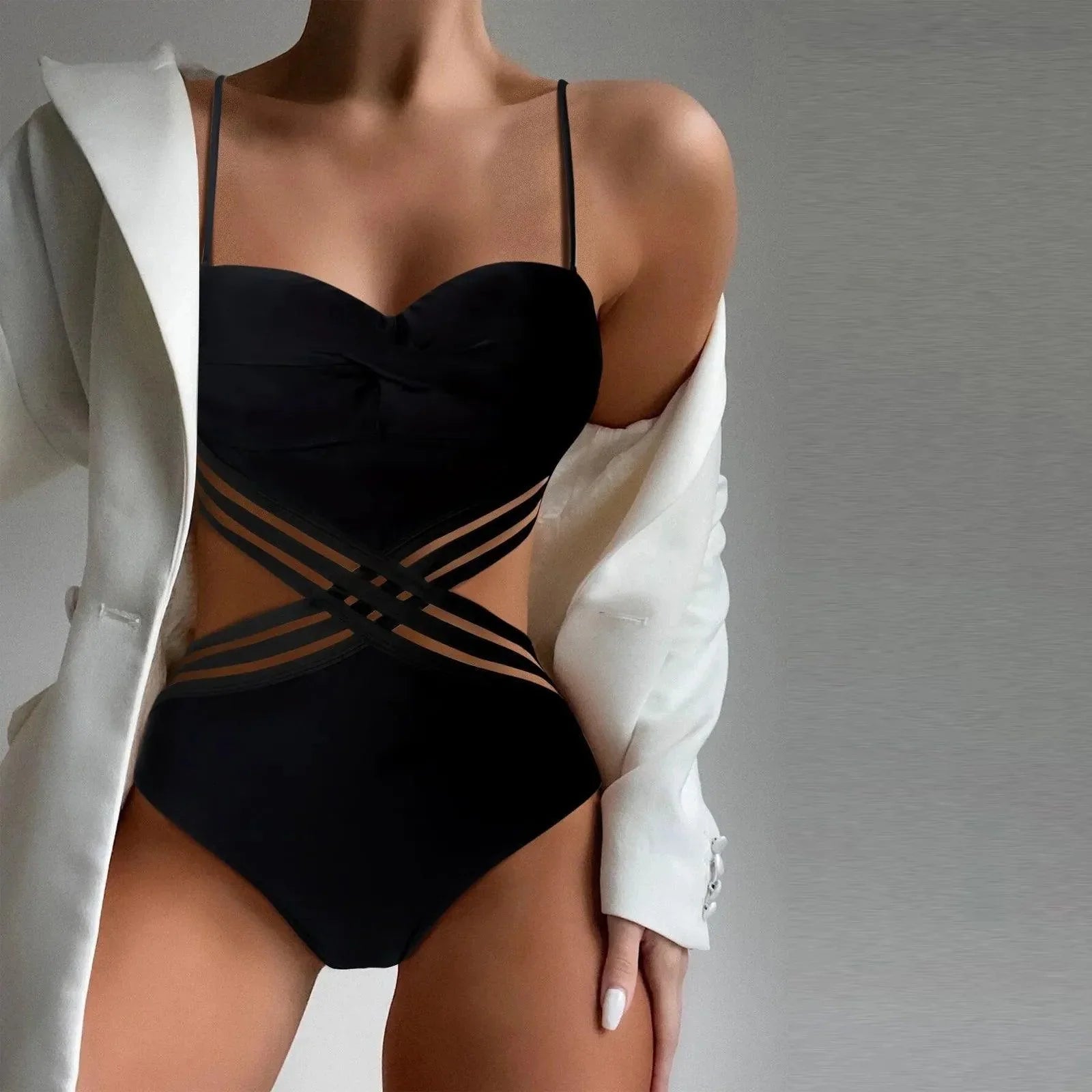 Model Maya to połączenie elegancji i nowoczesności. Jednoczęściowy krój z ozdobnymi wycięciami i transparentnymi paskami subtelnie eksponuje sylwetkę, jednocześnie zapewniając komfort i stabilność dzięki regulowanym ramiączkom.